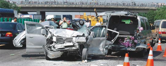 中新網10月16日電 據臺灣《聯合報》報道,臺灣中山高彰化路段十五日發生四死五傷重大車禍,一輛滿載丁烷的化學槽車,前晚近十時為閃避爆胎前車翻覆,北上車道大塞車至昨天近中午時,一輛客運從后方高速沖撞車陣,連環撞爛十四輛車,現場慘不忍睹。