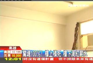 據臺灣TVBS電視臺報道,高雄縣一名女子這幾天發現墻角天花板流出暗紅色、有臭味的水。報警后,警方到公寓3樓開門,才發現在房間里有一具發黑浮腫的男尸倒臥床上,尸水滲出棉被流到地板再滲進樓下房間,驚悚情景猶如恐怖電影情節。