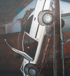 但因為他那時已經喝茫,加上天雨、視線不清楚,且車尾面對陡下坡,竟然就這樣沿著電線桿的接地線開上電桿、發出“碰”一聲巨響,整臺車頭下腳上倒立、貼在電桿上,兩人簡直嚇壞了。幸好前座在下方,兩人趕緊開車門出來。