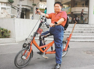 “我終于可以騎自行車兜風了!”他說,曾5度騎摩托車環島,現在也可以騎自行車環島;因手動自行車非常耗體力,最近他在自行車后方加裝電動裝置,電池充完電可以跑六、七個小時,手動騎累了,就轉換成電動。