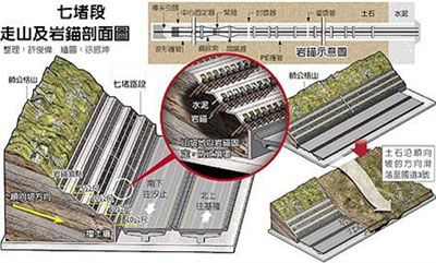 臺“國工局”規劃組人員26日調出1993年的設計規劃資料,帶著設計圖到現場比對,發現災變段地質狀況與設計之初無異,地層滑動方向也是順向坡,但下方巖錨抓力擋不住山頭高點的山崩,初步判斷極可能是山崩規模和范圍超出當時巖錨防護設計。