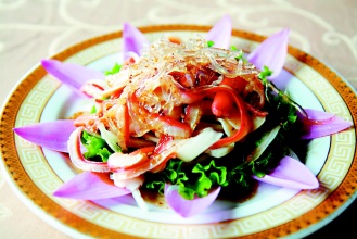 新興園購入一斤將近3百元的蘭花蚌,將蚌肉汆燙后以冰塊冰鎮(zhèn),保持蚌肉彈性;在盤中鋪上一圈香水蓮花花瓣,淋上少許色拉,再放上切絲洋蔥做底;將蘭花蚌肉放在洋蔥上,加上少許脆藻,最后淋上特調(diào)和風(fēng)醬,一盤如蓮花盛開的料理就呈現(xiàn)在眼前。