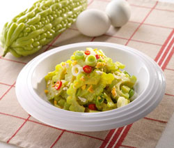 苦瓜含有豐富的維生素,只是苦瓜味道苦,許多大人、小孩都不愛,讓媽媽們實在傷透腦筋;但一道客家小炒“苦瓜黃金蛋”打破許多人不吃苦瓜的慣例,事前的準備工夫也很簡單,只要抓到降低苦瓜苦味的小撇步,馬上成為一道可口佳肴;尤其若能采用萃取自上等天然鮮雞的鮮雞晶來調味,不但能提升菜肴的鮮甜度,經樞紐科技顧問公司專業證實,在等咸度下,還可以減少40%的鹽份攝取,對人體健康較無負擔。