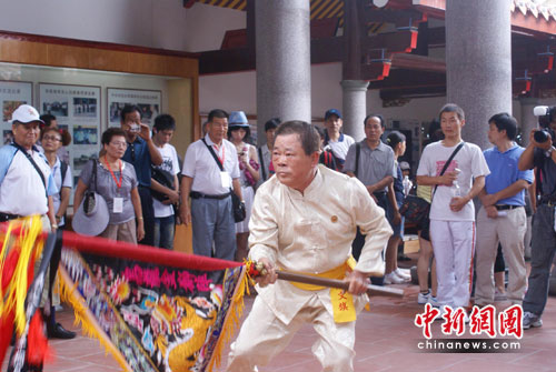 國際級九段武術裁判、臺灣國際武術總教練楊文旗已是第三次到永春拜祖了。去年參加首屆海峽論壇,楊文旗有機會到永春,并尋找了根:“自己家族傳承了110多年的武術就是永春白鶴拳”,他便與永春結下了難解之緣。這次,楊文旗和弟弟特地從臺灣帶來了“七星旗”,并在白鶴拳創始人方七娘塑像前行起了寓意對祖上長輩無比尊敬的“七星旗”大禮。