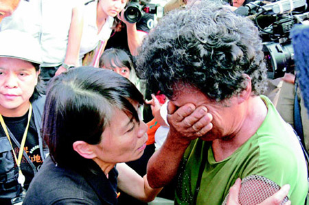 另外幾個(gè)地方,同樣有許多聲淚俱下的災(zāi)民,她依然不斷輕撫災(zāi)民的肩、背,撫慰大家:“我們一起面對困難,要堅(jiān)強(qiáng)、勇敢地站起來,走出難關(guān)。”