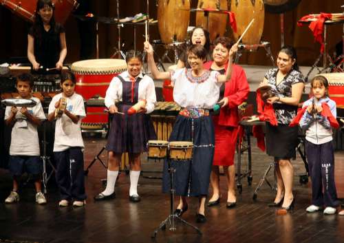 連秀3場(chǎng)打擊樂(lè)的周美青并未上臺(tái),隨行媒體記者則起哄要馬英九表演,但馬英九仍不為所動(dòng),只坐在臺(tái)下欣賞。