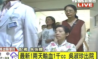 中新網(wǎng)7月10日電 據(jù)臺灣TVBS報道,陳水扁夫人吳淑珍9日因痔瘡出血,失血過多導(dǎo)致低血壓,送醫(yī)急救,醫(yī)院兩天內(nèi)幫她輸血1000毫升,并與施打鐵劑,身體好轉(zhuǎn),吳淑珍10日下午出院。