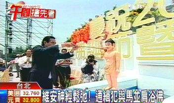 當(dāng)時(shí)情景是:觀禮臺(tái)上,馬英九就坐在佛祖香案左手邊第一個(gè)位置,通緝犯林松輝“以中華理教總會(huì)”理事長(zhǎng)名義大剌剌坐在香案另一頭,和馬英九相隔僅僅10米。
