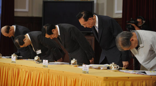 中新網8月19日電 “莫拉克”給臺灣造成慘重災害,馬英九18日親上火線連開兩場記者會。在120分鐘里,馬英九彎腰鞠躬七秒、五度致歉,坦承救災有疏失,除批準“外交部政務次長”夏立言辭呈,他與劉兆玄已決定對失職官員祭出懲處,“時間不會晚過9月初”。 有臺灣媒體認為,馬英九祭出懲處令,預告劉兆玄“內閣”即將改組。