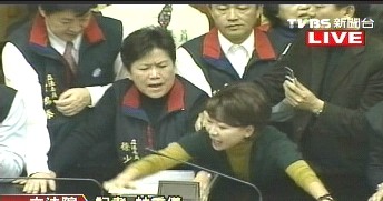 民進黨“立委”趁機沖上主席臺,企圖阻撓“立法院長”王金平進行表決程序,而藍營“立委”也不甘勢弱圍堵,雙方便在主席臺上僵持。