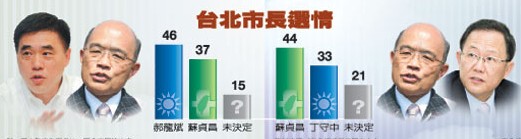 除了郝龍斌尋求連任,丁守中也傳出有意競逐臺北市長寶座。不過,若國民黨改由丁守中出馬,則藍營優(yōu)勢不再,蘇貞昌支持度四成四,領先丁守中十一個百分點,另有二成一未決定。