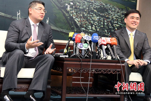 5月6日下午,中國國民黨榮譽(yù)主席連戰(zhàn)之子連勝文(左)以身體原因及階段性任務(wù)完成為由,正式請(qǐng)辭臺(tái)北悠游卡公司董事長,獲臺(tái)北市長郝龍斌勉強(qiáng)同意。對(duì)于在悠游卡公司不足兩年的工作表現(xiàn),連勝文給自己打80分。記者會(huì)吸引大批記者,談及自己離開該公司的不舍,連勝文一度哽咽、噙淚。中新社駐臺(tái)記者 董會(huì)峰攝