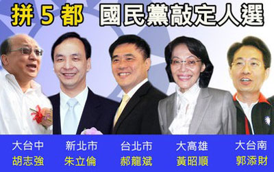 昨天,國民黨中央提名審核委員會決定“五都”征召人選,國民黨秘書長金溥聰宣布臺北市、新北市、大臺中、大臺南、大高雄分別征召臺北市長郝龍斌、“行政院副院長”朱立倫、臺中市長胡志強、前“立委”郭添財、“立委”黃昭順代表國民黨參選。