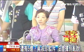 中新網6月28日電 據臺灣TVBS報道,有周刊爆料,陳水扁在海外資金除了7.4億元(新臺幣,下同)外還有一筆5億元款項,面對這樣說法,陳水扁妻子吳淑珍嚴詞駁斥,說沒有證據的話別亂說。