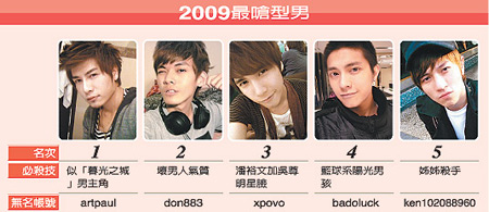 奪得去年年度總冠軍的型男森田是職業模特兒,曾擔任“今天你要嫁給我”MV男主角,也拍過電廣告,外型酷似電影“暮光之城”男主角羅伯派丁森。第二名的世新大學新聞系大三生吳東穎,外型帶點壞男人的味道。他每周會到誠品三、四次,從雜志上得知最新流行信息,參考風格。