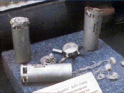 據(jù)美國科學(xué)家網(wǎng)站資料指出,美軍石墨炸彈在空軍編號為BLU─114/B,是透過在易拉罐大小的罐內(nèi)裝進(jìn)大量石墨絲,然后將這些石墨罐再裝進(jìn)較大的集束彈體中,以子母彈的方式進(jìn)行投射,石墨彈在散開后,尾部還會掛載降落傘,以利于讓罐內(nèi)石墨絲大面積散開,并平均落在發(fā)電廠或高壓電纜上,讓電纜瞬間燒毀。