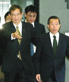 謝長廷﹝右﹞拜訪李遠哲﹝左﹞,兩人針對能源、生物科技交換意見,隨后李遠哲送謝長廷下樓。(臺灣《聯合晚報》圖)