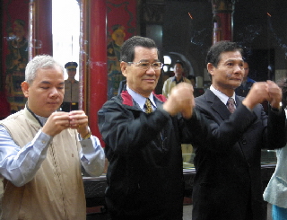 蕭萬長(圖中)21日上香參拜,希望臺灣經濟奇跡再起。(來源:臺灣《中華日報》)