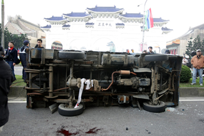 中新網12月6日電 臺北中正紀念堂前發生意外。上午十一時左右,有男子駕駛貨車沖撞“大中至正”門口的人群,其中一名正在采訪的記者受重傷。