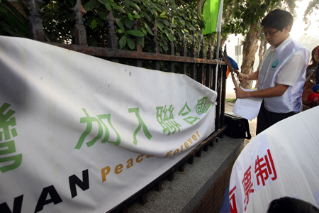 臺第三社會黨發言人剪斷官方“入聯”布條(圖)