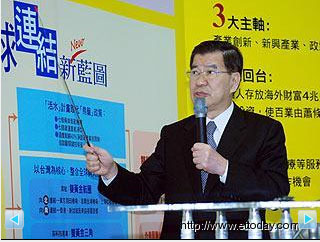 馬英九發(fā)言后,蕭萬(wàn)長(zhǎng)作為“經(jīng)濟(jì)發(fā)展總設(shè)計(jì)師”上臺(tái)發(fā)表馬蕭“全球連結(jié)與產(chǎn)業(yè)再造”第二波經(jīng)濟(jì)新藍(lán)圖。