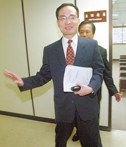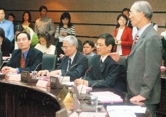 泛藍執政縣市主張“立委”選舉和“公投”采二階段領投票,臺當局“行政院”昨天開鍘,把臺北市選委會主委吳秀光免職(左一)。圖為臺“中選會”主委張政雄(右一)二十一日邀集縣市地方選委會主委開會,吳秀光和張政雄各說各話,沒有交集。(臺灣《聯合報》資料圖片)