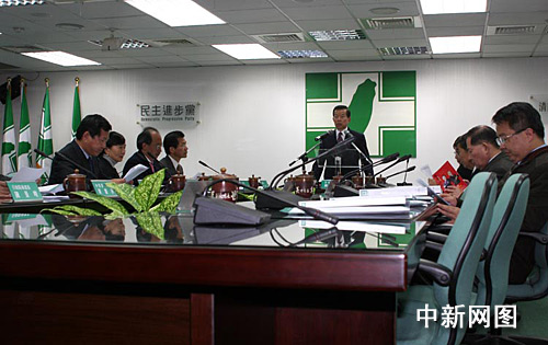 一月十六日,民進(jìn)黨召開(kāi)“立委”選舉后的首次中常會(huì)。圖為會(huì)議現(xiàn)場(chǎng)。中間為新任民進(jìn)黨主席的謝長(zhǎng)廷正在主持會(huì)議。作者:陳立宇