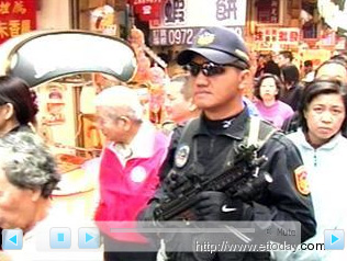 中新網2月4日電 民進黨“大選”參選人謝長廷4日到高雄市拉票,拜年的隊伍把現場擠得水泄不通,其中引人側目的是,戒護維安人員第一次背出罕見的攻擊沖鋒槍,在熱鬧的拜年隊伍中顯得相當突兀。