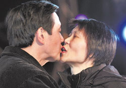 中新網2月15日電 據臺灣中國時報報道,常給人酷酷形象的周美青,一直未在“大選”時出面助選,十四日情人節晚上首度和馬英九同臺,兩人三度擁吻,合唱“今天你要嫁給我”,還感性推銷馬英九雖不懂人情世故,但正直、善良、敦厚、溫和、認真、負責。