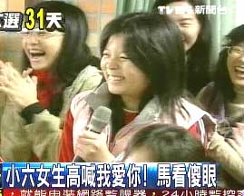 報道稱,這名名叫陳琳璦的小女生高喊“我愛你”,連身經百戰的馬英九也“凍不住”了,愣在那里,手中的麥克風拿起來又放下,連話都說不出來,這個時候小女生竟然哭了。馬英九忙說:“不要哭,不要哭,我也愛你。”