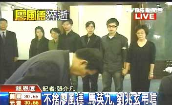 據臺灣TVBS報道,廖風德因病猝逝可謂“驟失英才”,讓人措手不及,他的家人在慈恩園為他布置靈堂,在今天上午10點開始讓親友吊唁,面色凝重的馬英九、準“行政院長”劉兆玄、“立委”蔣孝嚴也來到靈堂送他最后一程。