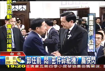 中新網(wǎng)5月15日電 5月20日臺(tái)灣當(dāng)局將進(jìn)行權(quán)力交接。即將卸任的陳水扁和就要接棒的馬英九,14日在柏楊追思會(huì)上相遇。陳水扁與馬英九碰頭后,兩人除了進(jìn)出場兩度握手后,沒有其它互動(dòng)。