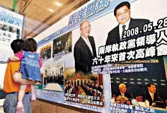 趕在7月4日大陸觀光客首發(fā)團(tuán)來(lái)臺(tái)前夕,國(guó)民黨2日連夜重新布置一樓大廳的兩側(cè)墻面,將原先的國(guó)民黨創(chuàng)黨113周年紀(jì)念展照片全數(shù)撤下,換成以“兩岸關(guān)系雨過(guò)天晴”等為主題的照片展,其中“胡連會(huì)”與“胡吳會(huì)”的歷史鏡頭,被放大貼在一樓大廳的左側(cè)墻面,所有訪客進(jìn)入大廳時(shí),都會(huì)看見(jiàn)吳伯雄與胡錦濤的大合照。