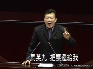 民進黨“立委”蘇震清嗆聲說,“馬英九把票還給我!”不過國民黨“立委”徐少萍馬上反擊:“我不知道蘇委員你是不是把票投給馬英九,不然你不能代表所有的臺灣同胞。”