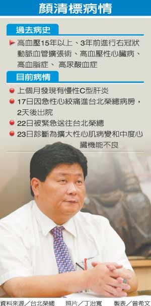 據臺灣《聯合報》報道,外界質疑顏清標裝病逃避入監,其主治醫師周嘉裕表示,顏清標的心臟明顯擴大,有嚴重肺積水等病癥。他反問:“像肺水腫這種,怎么假裝?”