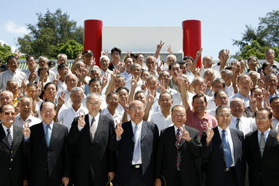 紀念“八•二三”炮戰(zhàn)五十周年,吳伯雄(前排中)18日到金門參加相關活動。(“中央社”圖)
