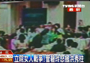 但國民黨“立委”洪秀柱上前制止時,將綠營女“立委”手中的廣告牌撥向一旁管碧玲的助理,造成助理眼睛受傷,管碧玲不滿上前理論,情急下居然打了洪秀柱一巴掌,讓洪秀柱火冒三丈爆發拉扯。