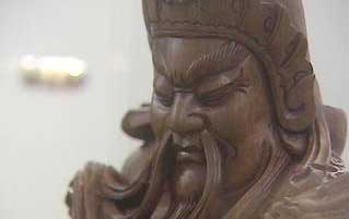 在8月初記者會曝光的關公神像,一走入陳水扁卸任后的辦公室,柜臺顯得空蕩蕩,沒有什么擺設,往內一走在廊道的正中間,馬上映入眼簾的就是長長的三個擺飾柜,一共有六樣紀念品,但最受矚目的是一尊木雕的關公像,長長的胡子略帶笑容,一派自在的關公悠閑的坐在椅子上,既沒有拿刀也沒有看書,反倒像是笑看世間事,左下側也有一尊玉雕的關公頭像,也就是半身關公。
