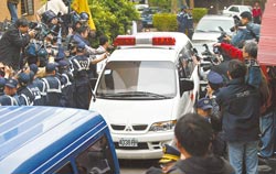 遭羈押因禁食而戒護送醫的陳水扁經3天療養后,19日下午1點從板橋醫院還押臺北看守所,車道兩旁的媒體隔著大批維安警察搶拍救護車內的阿扁。(王錦河攝)