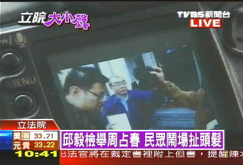 中新網(wǎng)12月15日電 綜合臺(tái)灣媒體報(bào)道,陳水扁日前遭到無(wú)保釋放,“立委”邱毅今天(15日)前往“監(jiān)察院”檢舉承辦法官周占春瀆職,不過沒想到步出“監(jiān)察院”時(shí),與綠營(yíng)民眾發(fā)生肢體沖突,甚至有人一把扯下邱毅的頭發(fā)。