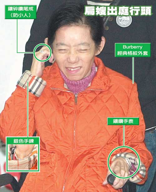 吳淑珍出庭現身,一件亮橘色的外套,讓她看起來氣色很好。這件鋪棉外套是吳淑珍最愛的英國名牌Burberry熱賣款,一件要價25000元;另外,雖然沒有滿身珠光寶氣,但看她揮手致意,右手小指戴了1克拉鉆石,這只防小人的尾戒也要大約60萬。