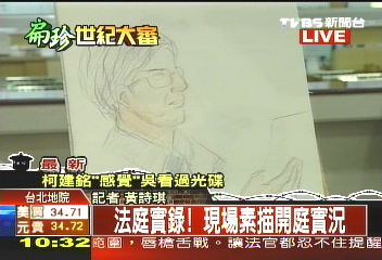 而在法庭內(nèi)的素描,坐在被告席上的陳水扁看來(lái)有些駝背,面前擺著一臺(tái)計(jì)算機(jī),所有對(duì)話(huà)都會(huì)在計(jì)算機(jī)中顯現(xiàn)出來(lái),在被告席左邊的是律師席,坐著陳水扁律師鄭文龍,而被告席正對(duì)面就是審判者蔡守訓(xùn),蔡守訓(xùn)一開(kāi)始問(wèn)陳水扁是不是心跳加速、會(huì)氣喘?陳水扁連話(huà)都沒(méi)有說(shuō),只是點(diǎn)點(diǎn)頭,低頭看著計(jì)算機(jī)屏幕。