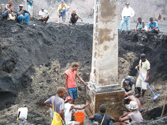 由于碑體幾乎被火山灰覆蓋,項(xiàng)目小組遂請當(dāng)?shù)貎S民協(xié)助開挖,原先因干熱土質(zhì)極硬,小組原擔(dān)心挖掘會(huì)不順,但開挖前晚又下大雨,土質(zhì)變軟,第二天又變成涼爽陰天,挖掘相當(dāng)順利,很快就讓整個(gè)紀(jì)念碑完整露出,上刻“中國廣東民眾死亡紀(jì)念碑”。
