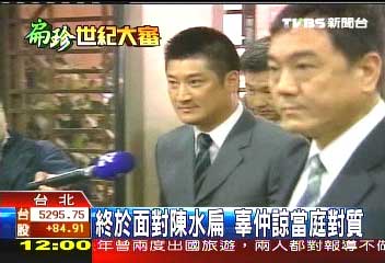 辜仲諒坐在證人席上、蹺著二郎腿等待庭訊開始,看似輕松的外表下,其實內心有點忐忑緊張,當陳水扁踏入法庭時,兩人都刻意避開眼神交集。
