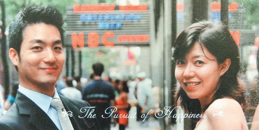 國民黨“立委”這兩天收到一張喜帖,喜帖印上一對俊男美女微笑合影的卡片,背景是紐約第五大道NBC總部大樓,喜帖最下端有一行“The Pursuit of Happiness”英文字,襯托新人臉上洋溢的幸福。