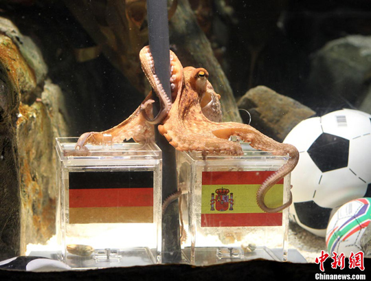 世界杯開賽后,來自德國的章魚“保羅”已經成功預測對了此前德國隊五場比賽的勝負結果,頓時名聲大振。半決賽前,德國人再次請出“保羅”預測,這次“保羅”預測的是西班牙獲勝。沒想到,它又對了!