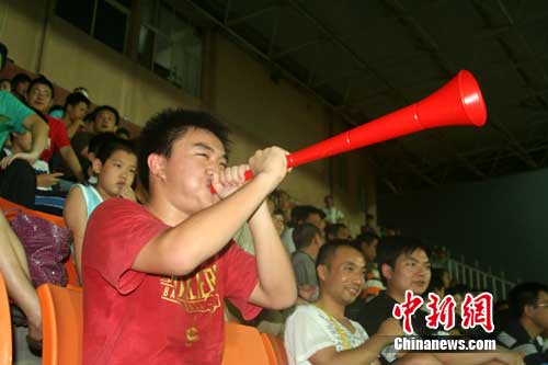 中新網南昌7月14日電(劉占昆)南非世界杯剛落下帷幕,2010年中超聯賽重燃戰火,14日晚上,記者在中超賽場中,看到許多球迷拿著南非世界杯特有的助威“大喇叭”為球隊助威,這就是可以發出超過一百分貝的“呼呼塞拉”,此前在中超賽場中從未出現過。