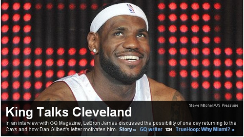 中新網(wǎng)8月18日電 在九月的《GQ》雜志專訪上,“皇帝”詹姆斯首次敞開心扉,談到了他為何會(huì)出走至熱火打球,以及未來重返克利夫蘭效力的可能性。