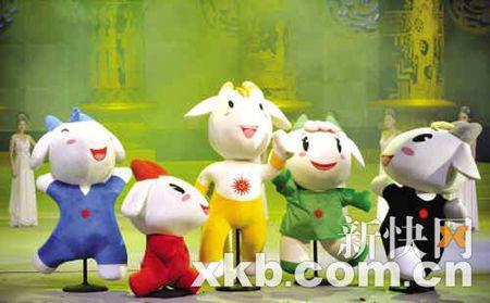 “五羊”是廣州市最為知名的一個標志,以五只羊作為吉祥物,充分體現了東道國、主辦城市的歷史底蘊、精神風貌和文化魅力。這五只羊有著與北京奧運會吉祥物“北京歡迎你”類似的名字,“阿祥”、“阿和”、“阿如”、“阿意”、“樂羊羊”組成“祥和如意樂洋洋”。