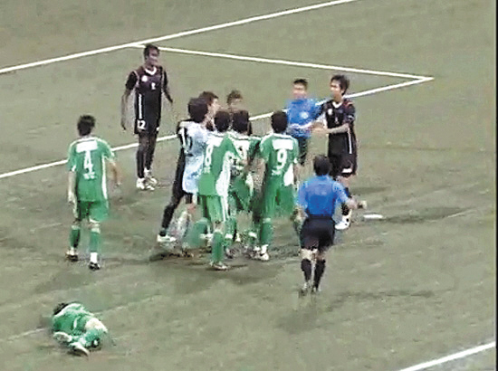 其實(shí)從上半場(chǎng)開始,兩隊(duì)球員你來我往,態(tài)度強(qiáng)硬,互不相讓,已經(jīng)隱約讓人感覺到一絲火藥味。到了下半場(chǎng),雙方的動(dòng)作越來越粗野。第88分鐘,場(chǎng)上比數(shù)為1比1時(shí),北京國安隊(duì)的5名球員突然包圍幼獅隊(duì)的一名球員。接著,兩隊(duì)的球員紛紛沖進(jìn)球場(chǎng),彼此拳打腳踢打成一團(tuán)。